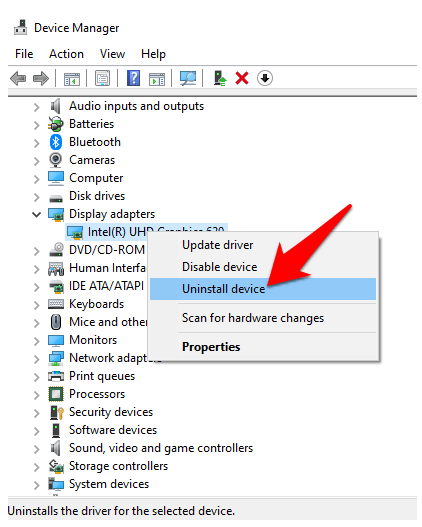 장치 관리자 창에서 다음을 클릭합니다. 디스플레이 어댑터비디오 카드를 마우스 오른쪽 버튼으로 클릭하고 선택하세요. 제거. 클릭 확인 제거를 완료하려면.